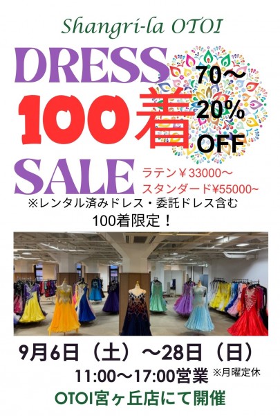 9月6日(土)~28日(日)まで宮ヶ丘店2階イベントフロアにて「ドレス100着セール」を開催いたします。ロングラン開催の為、後半はセールドレスが品薄になる可能性がございますので、お早目にご来店ください。