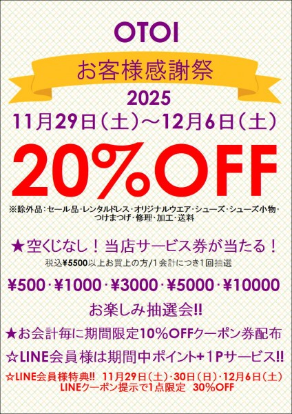 毎年恒例の「お客様感謝祭」今年は11月29日(土)より12月6日(土)まで開催いたします。皆様お誘いあわせの上、ぜひご来店ください。尚、当店LINE会員様は期間限定で更にお得にお買い物ができるクーポン券を発行いたします。おともだち登録されていない方はこの機会にぜひご登録ください。アカウントは@otoi で検索してください。皆様のご来店をお待ちしております。