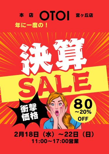 2月18日(水)~22日(日)までOTOI各店舗年ににて年に一度の決算セールを行います。本店目玉品→アウトレットダンスシューズ¥2200~ 宮ヶ丘店目玉品→アウトレットデモドレス¥55000~その他